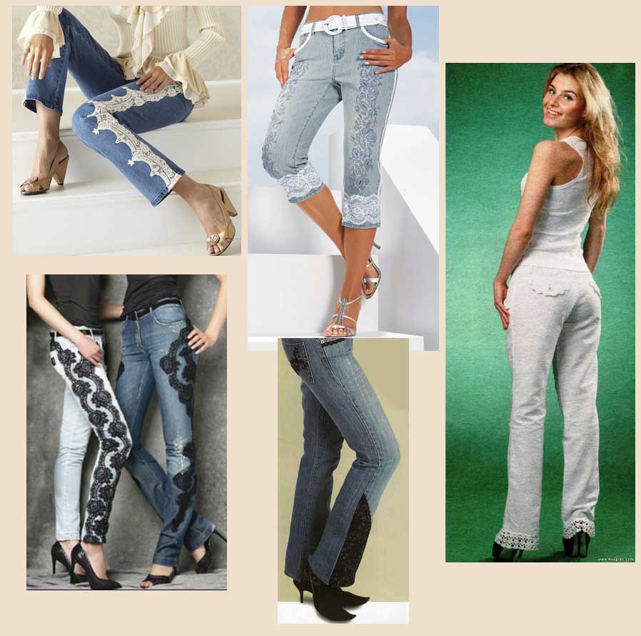 Чем оригинальнее и необычнее – тем интереснее. Кружево можно наложить сверху на джинсовую ткань и декорировать брюки с помощью аппликации либо сделать разрезы на ткани и вшить кружевные вставки.