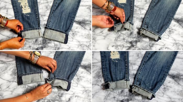 Выбрав нужную ширину, прострочите джинсы или же просто заверните их ровно наружу, приметайте по швам и займитесь декором полученных манжет:
