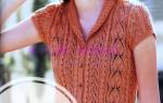 Связать спицами 3; 3,5; 4; 4; 4,5-5см. Опять берем в работу отложенные п. Для этого пересаживаем их на рабочие спицы и одновременно по бокам от центральной части поднимаем по 7; 8; 8; 9; 9п. Продолжаем на этих п. выполнять платочный рисунок еще 1,5; 2; 2; 2; 2см.