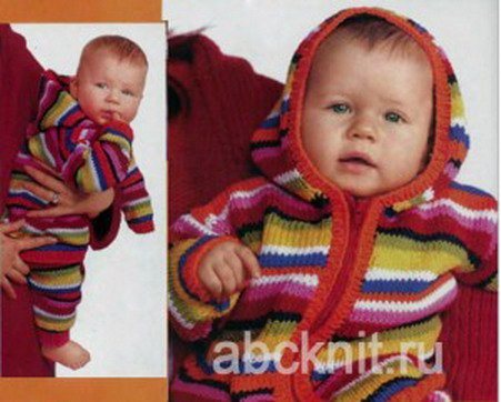 Если у вас в закромах завалялись остатки пряжи разных цветов, то вы их можете пустить в дело, связав для крохи вот такой яркий полосатый костюмчик спицами. Эта модель подойдет как мальчику, так и девочке, все зависит от того, каких цветов пряжу вы будете использовать.