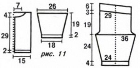 Спицами набираем 38 п., 10 р. фантазийн. уз., далее лицев. гл., прибавляя по обе стороны в кажд. 8 р. 3 х 1 п. = 44 п. На выс. 15 см закрываем по обе стороны по 2 п., после чего убавляем в кажд. 2 р., отступая 2 п. от края, 5 х 1 п. = 30 п., откладываем их. Высота – 18 см.