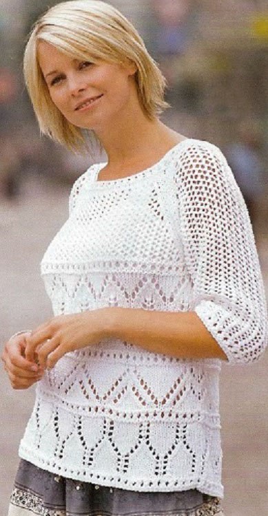 Из тонких хлопковых ниток можно связать летний топ красивым горизонтальным ажурным узором спицами