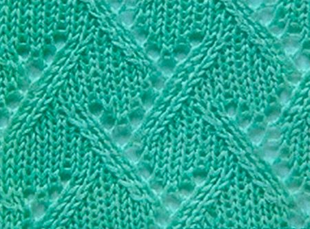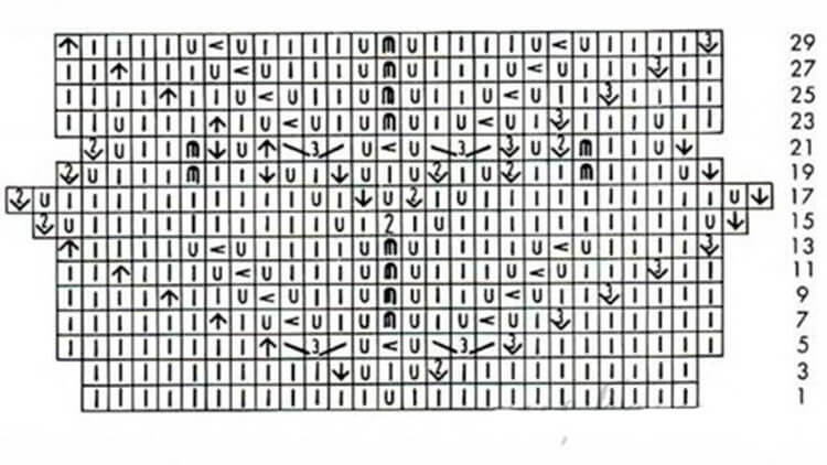 Технология рисунка состоит в том, что платочная вязка постоянно чередуется с накидом и провязыванием двух петель в одну в лицевых рядах. В начале схема приходит в расширение, затем в сужение, а ряды с изнанки вяжутся по схеме.