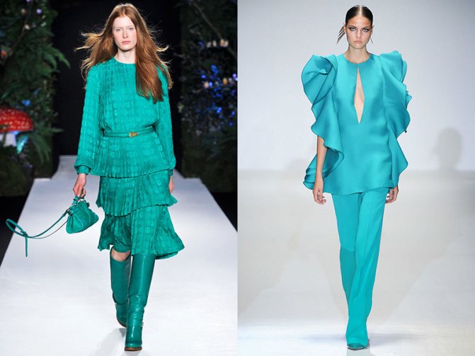 - Бирюзово-зелёный. Отлично приживётся в шкафу каждой девушки в качестве свежей цветовой гаммы для модной одежды в деловом, спортивном или классическом стиле. Выигрышно смотрится с тёмно-розовым, серым, коричневым, бронзовым, золотистым оттенками.