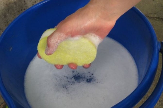В соседнюю емкость наливают чистую теплую водопроводную воду. Мягкой стороной губки покрывают шампунем загрязненные зоны и без нажима протирают их. Процедуру осуществляют до тех пор, пока пятно не пропадет. Затем шубу обрабатывают чистой жидкостью при помощи ветоши из запасенного тазика.