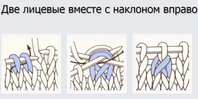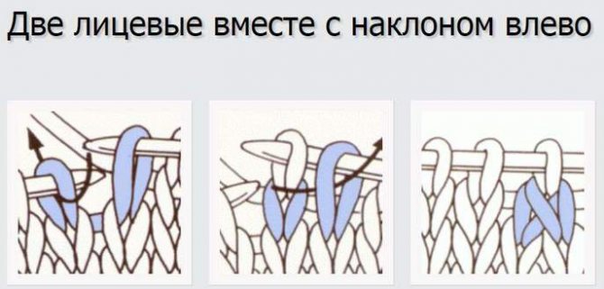 Провязать среднюю лицевую петлю, четвёртую и пятую петли провязать вместе лицевой с наклоном вправо.