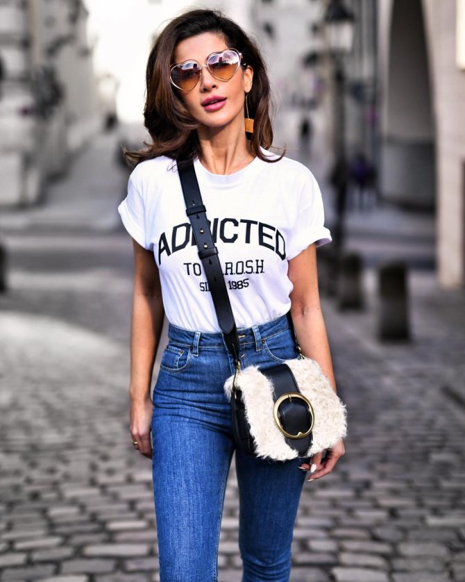 Образ, в котором присутствует футболка и джинсы, смотрится не скучно и даже оригинально, при условии, что в качестве верха используются модели с ярким декором. В тренде длинные, укороченные модели, футболки свободного кроя, футболки-поло и другие варианты. Все они великолепно смотрятся в образах девушек, которые предпочитают сочетать их с брюками и джинсами. Предлагаем познакомиться с актуальными сочетаниями футболки и джинсов, которые будут популярны в нынешнем сезоне.