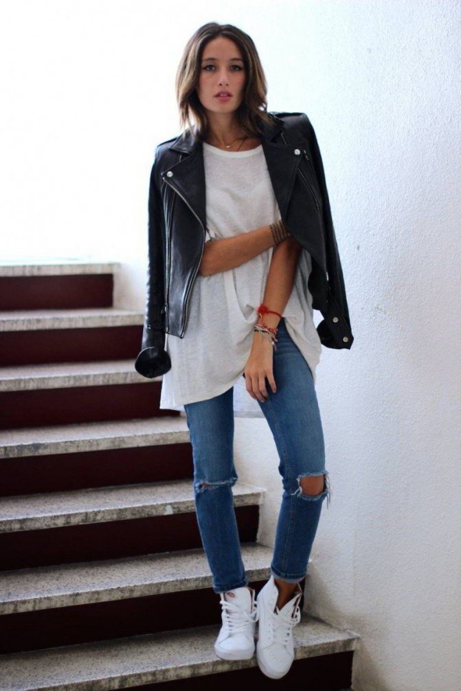 Длинная футболка красиво смотрится с прямыми джинсами с подворотами, с облегающими джеггинсами. Стилисты рекомендуют заправлять в джинсы переднюю часть футболки. В тренде однотонные футболки в белом и черном цвете, модели с боковыми прорезями. Такие модели отлично смотрятся с джинсами с прорезями и потертостями.