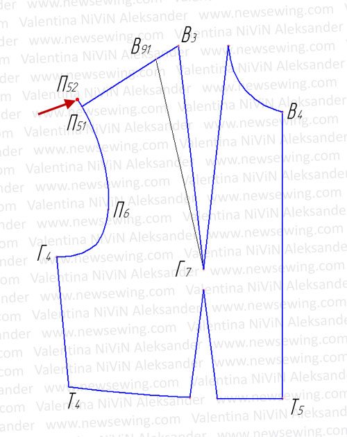 Для этого от точки Г4 вниз проводим линию до пересечения с линией талии. Вместе с боковой линией переносим боковую вытачку, как это показано на рис. 2.