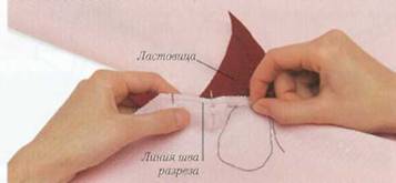 Если ткань изделия легкая, конец разреза для ластовицы нужно укрепить до того, как он прорезан, а ластовица из одной или двух деталей вставлена. Укрепить этот конец разреза можно квадратиком ткани или лентой для обработки швов. На плотных или очень плотных тканях достаточно прострочки стежком на одном месте, чтобы укрепить конец разреза.