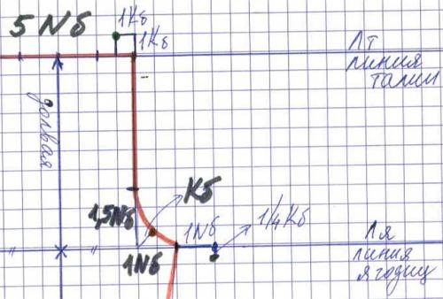 По вертикали бедер рисуем отрезок 1Nб = 5см. С полученной точки проводим линию к низу 1/4 Кб = 2,5/4 = 0,6 см.