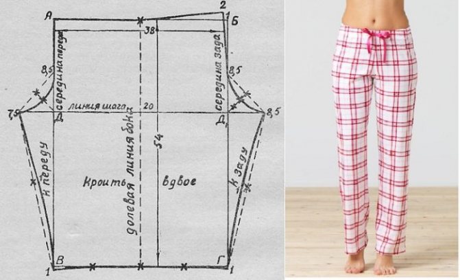 Выкройка для пижамных штанов может быть с выточками или без них. Выкройку с выточками используют для пошива пижамы из шелковых тканей. Без выточек для трикотажных тканей.