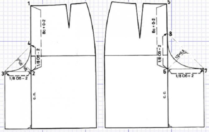 Делаем прибавку к вертикали коленки переда с двух сторон 1*Кб = 2,5 см. Делаем прибавку по вертикали низа переда с двух сторон 1*Кб = 2,5смм. Все точки соединяем линией.