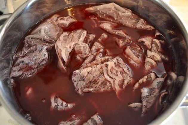 Готовую вещь прополоскать под тёплой температурой. Кружево в чёрный цвет красят таким же способом, но время воздействия уменьшают на 1/3.