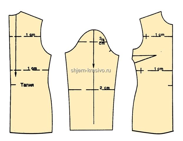 Другими словами, если вам необходимо укоротить выкройку лифа на 2 см., то на линии половины высоты проймы и половины расстояния от проймы до талии нужно отложить по 1 см.