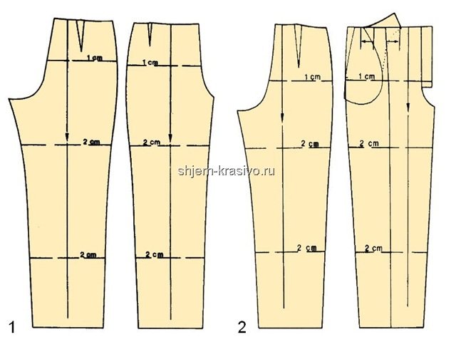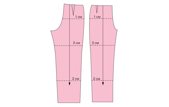 Брюки укорачивают (удлиняют) по верхней поперечной линии на 1 см. По половине разницы оставшейся длины, приходится на линию выше колена и на линию ниже колена.