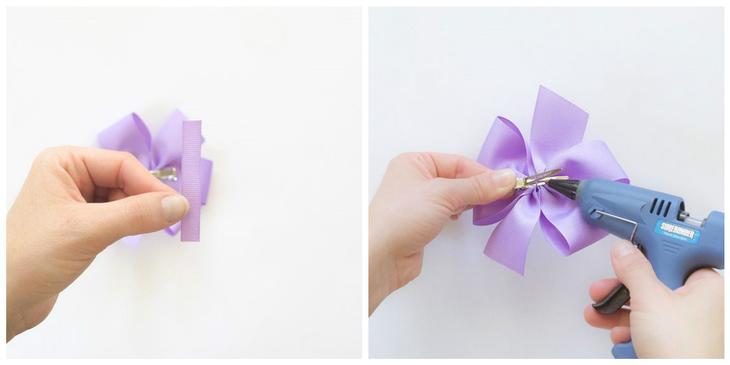 Берём узенькую ленту, оборачиваем бант по центру и с помощью горячего клея фиксируем с обратной стороны, одновременно маскируя под ней фиксирующий шов.