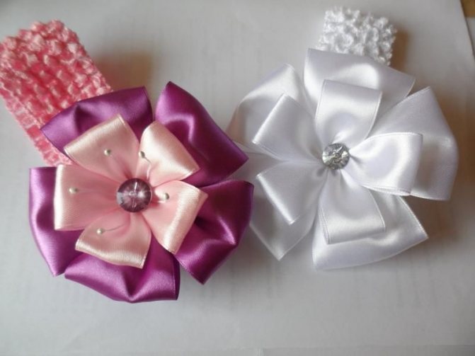 Эффектно смотрится поделка, украшенная мелким «жемчугом». Очень много зависит от качества ленты. Обычно выбирают для праздничных бантов белый цвет ткани или с небольшим серебристым отливом. Для создания одинаковых элементов вырезают картонный шаблон. Также понадобится клеевой пистолет и белая нитка с иголкой. Прикрепляют готовое изделие на резинку для волос пришиванием.