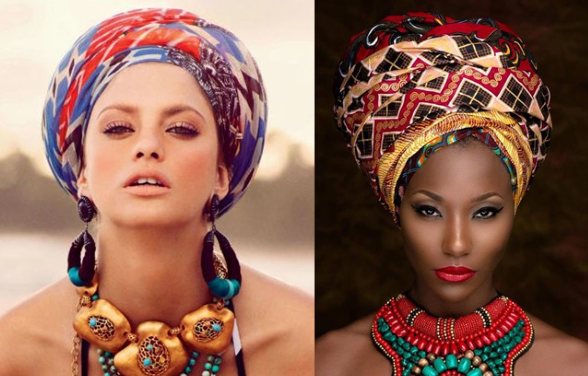 Первый палантин укладывается наискосок на макушку, концы завязываются в узел на затылке. Второй палантин аналогично укладывается на голову, наискосок, но естественно, с другой стороны. Узел завязывается сзади. Полученные хвосты следует сложить пополам на плечах – два кончика разного цвета слева и два конца справа. Далее следует техника обмотки с чередованием цветов. Кончики прячутся под слои ткани.
