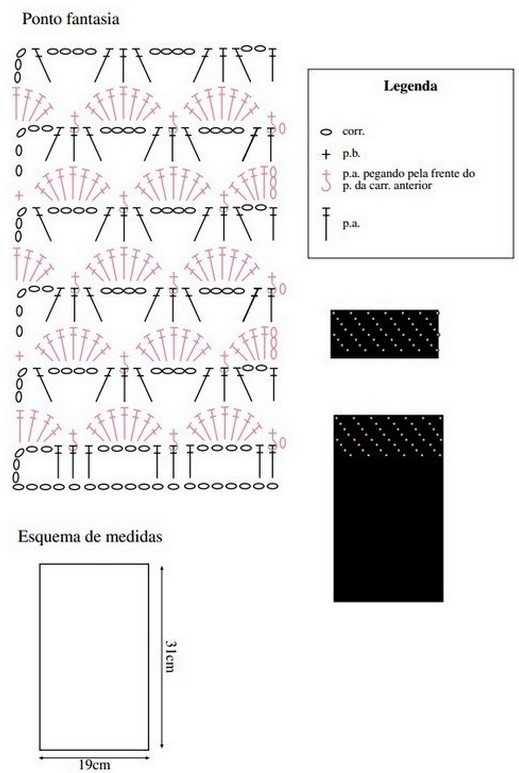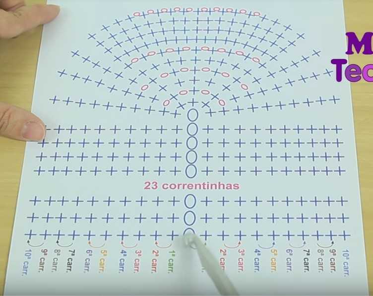 Опытная мастерица Хелен Марет из Португалии создала свою авторскую схему. Оригинальность идеи в выполнении полукруглых рядов, которые красиво ложатся и украшают модель. Толстым крючком №9-10 набирается цепочка из 23 воздушных петель, а потом по схеме вокруг цепочки вяжутся незаконченные ряды.