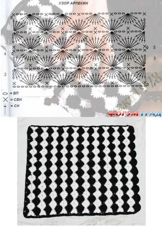 Из двух клубочков черной и белой пряжи создается настоящая вязаная красота! По представленной схеме крючком №2,5-3 провязываются зеркальные веера, и в каждом третьем ряду меняется цвет пряжи. Готовое полотно обвязывается по периметру черной нитью. По маленькой схеме выполняют боковушки.