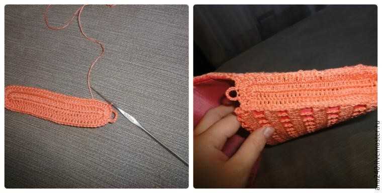 Для перехода на боковые бортики, провязываются два ряда столбиков б/н, и в первом ряду крючок цепляется за задние стенки петелек основания. Аналогично выполняется вторая деталь, и с помощью иглы с большим ушком половинки сшиваются друг с другом. При соединении часть петель остаются открытыми, и молния занимает свое место на верхней половине изделия.