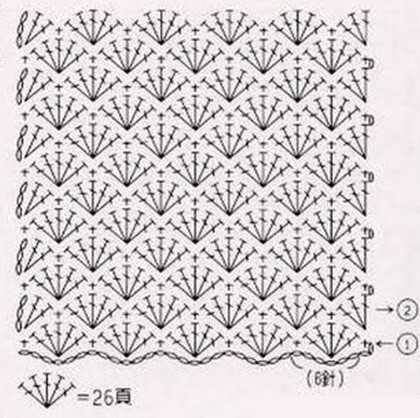 До начала работы сделайте основу из ненужной пластиковой папки и подкладочного материала. По схеме свяжите прямое полотно на необходимую высоту. Чтобы получить красивый косой край, в каждом ряду следует не довязывать один ажурный веерный мотив.