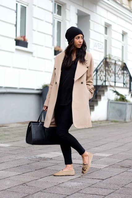 Шапка-бини черного цвета гармонирует с майкой, узкими брюками черного тона, двубортным пальто бежевого оттенка, прямого фасона, длиной до колен, объемной сумкой и мокасинами бежевой расцветки.