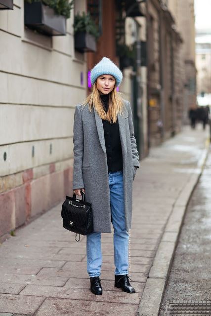 Объемная шапка-бини голубого цвета дополняет свитер черного тона, джинсы голубого оттенка, серое пальто прямого силуэта, длиной до колен, небольшую сумку и ботинки черной расцветки на среднем широком каблуке.