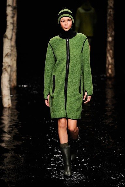 Шапка-бини зеленого цвета с черной полосой и помпоном из новой коллекции Hunter Original гармонирует с тонким пальто свободного силуэта, длиной выше колен, на молнии и резиновыми сапогами черной расцветки на низком ходу от Hunter Original.