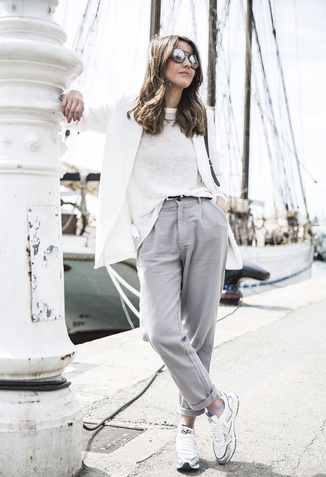 Если вы не мыслите собственные будни без спортивной обуви, ни в коем случае не стоит сочетать эти брюки с объемными кроссовками.