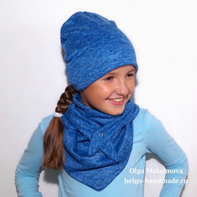 Осень… Пора утепляться. Сегодня покажу, как сшить шапку и снуд/платок/бактус. Снуд с застёжкой (я установила кнопку, можно сделать с пуговицей). Комплект сшила из трикотажа Ангора, из которого я шила себе свитшот со складками. Дочке очень понравилась расцветка и она захотела этот комплект именно из него. Трикотаж Ангора (с эластаном, цвет: голубой меланж) заказывала в магазине «МОДА.РУ».