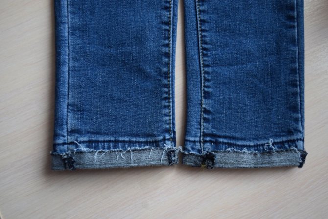 Большинство джинсовых брюк отличаются красивыми потертостями швов, в том числе понизу. Сохранение этой части, при укорачивании, сделает подгибку малозаметной.