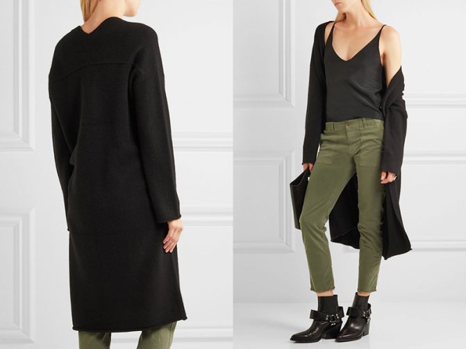 Совет! Для широких свободных кардиганов низ следует подбирать зауженным и нейтральных оттенков. Использовать можно как привычные джинсы, так и любые классические темные вещи.