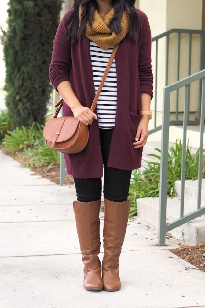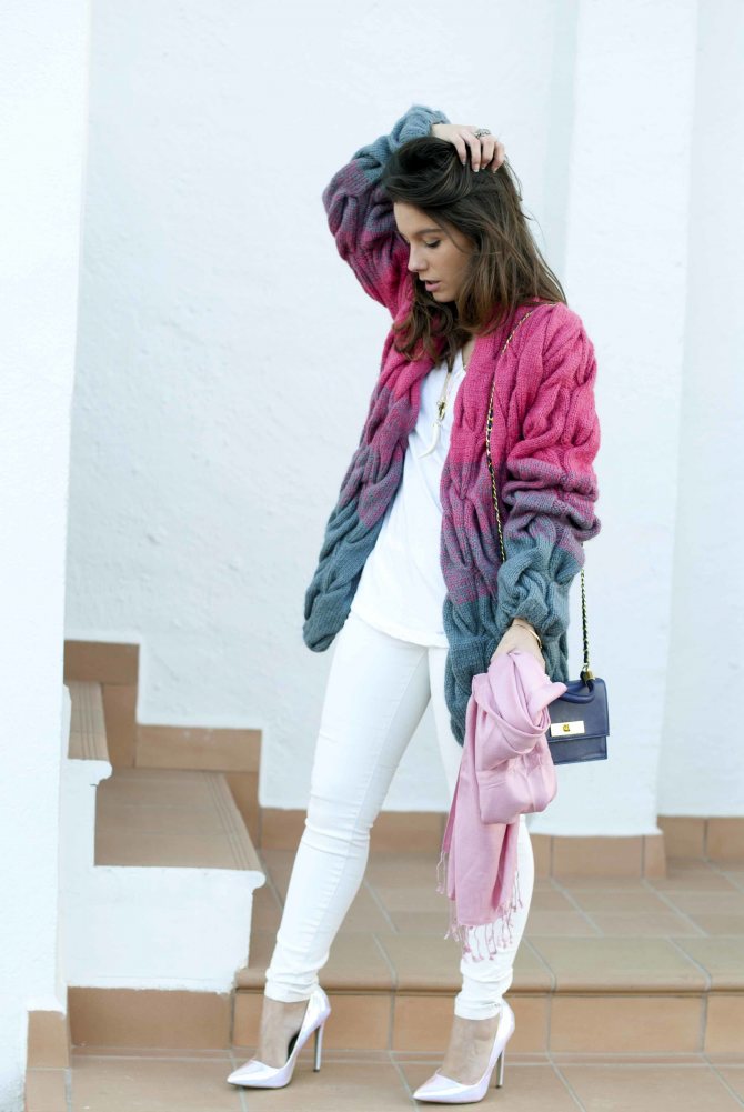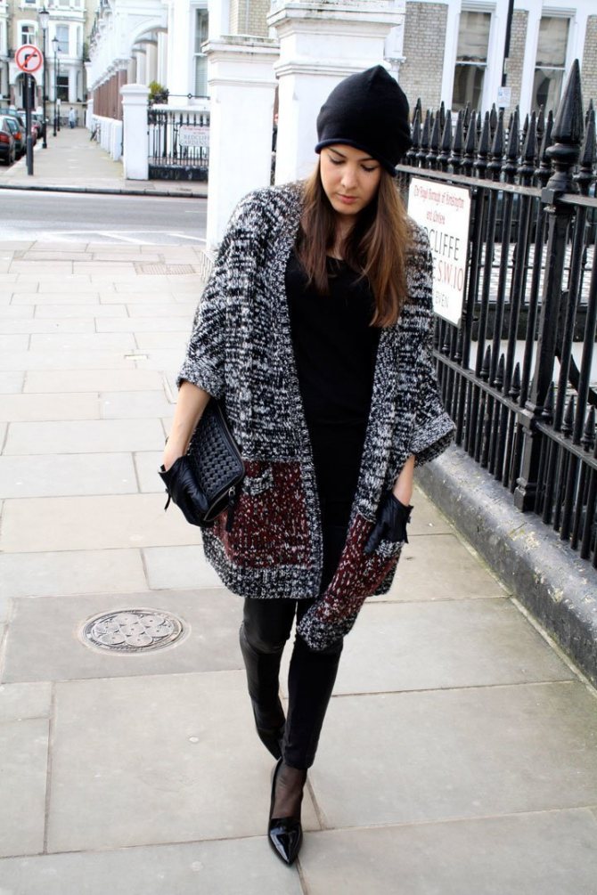 Идеальное сочетание: кардиган-джинсы и кардиган–классические зауженные брюки. Уже полюбившиеся нам бойфренды с потертостями и дырами или кожаные брючки тоже вполне будут уместны. Также идеально будут смотреться любые виды удлиненных кофт с миди юбкой-карандашом, леггинсами или лосинами. Вообще стилисты всегда подчеркивают, что объемный верх никогда не стоит комбинировать с широким низом.