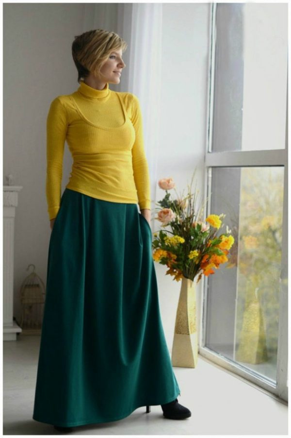 Пышная желтая юбка обычно является летним вариантом одежды. Это цвет хорошо сочетается с фиолетовым, голубым, черным или белым в полоску. Желтого тона следует избегать полным девушкам, так как он зрительно увеличивает фигуру.