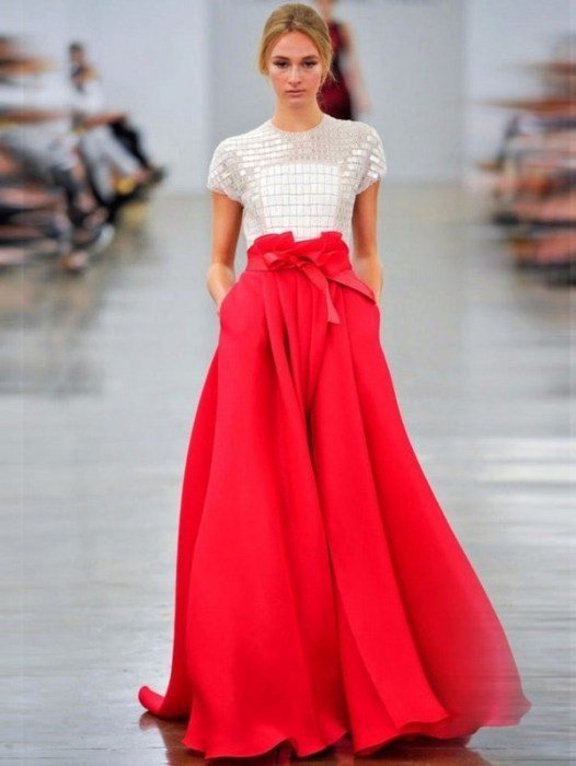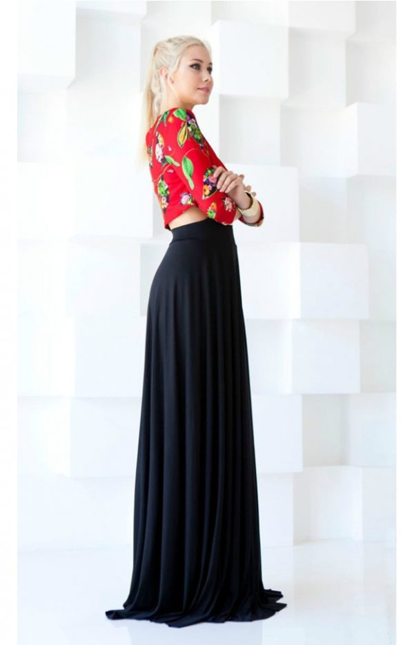 Пышная юбка в пол требует такого же праздничного верха. Это вечерние варианты одежды. Верхняя часть не должна быть перегружены деталями (воланами, оборками), но следует выбирать вещь из ярких тканей. Юбка и топ должны соответствовать друг другу.