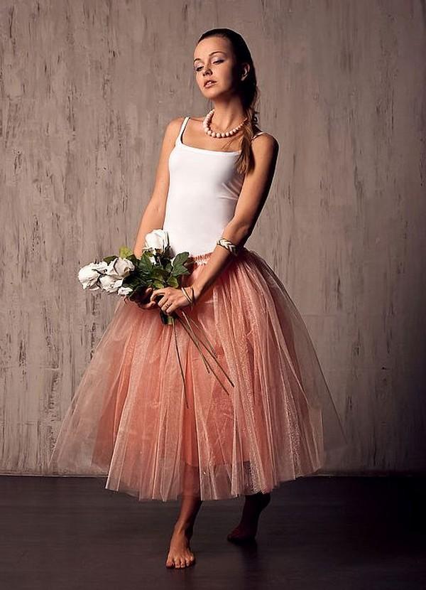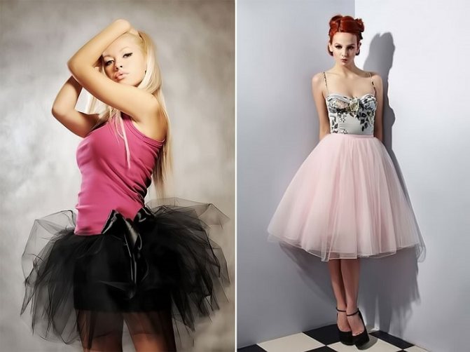 Особая популярность принадлежит пышным гардеробам, которые изготовлены из фатина. Они делают образ ярким и экстравагантным, особенно если в качестве дополнения выбраны уникальные аксессуары ручной работы. Они могут быть длинными в пол, короткими, миди. Возможно подобрать пачку из органзы нежной палитры, дополнить ее яркими туфельками-лодочками насыщенного цвета. Только от фантазии девушки зависит ее лук.
