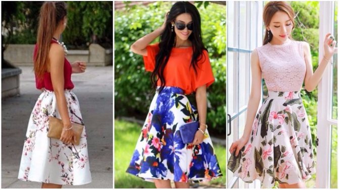 Зимой можно отдать предпочтение спокойной палитре оттенков, а для остального времени года подойдут более яркие и насыщенные гаммы. Особенной утонченности женщинам придают флористические мотивы на подоле. Приглушенная приталенная блуза и яркие цветы на юбке сделают лук экстравагантным и безупречным.