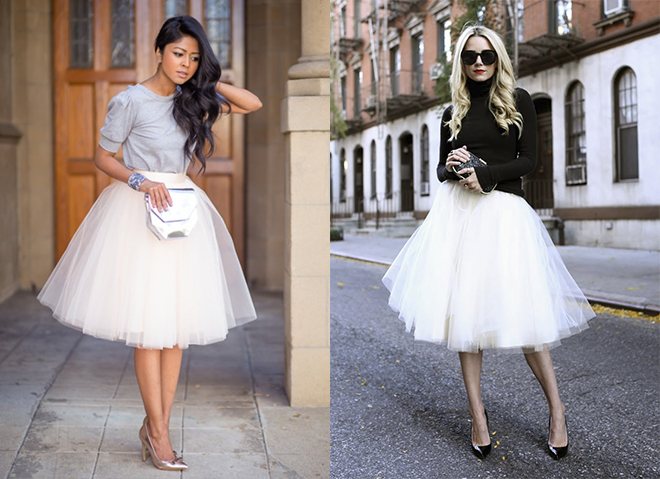 Пышная юбка миди длины является универсальным вариантом. Ее можно носить каждый день или надевать на выход. К светлому низу подойдет блузка из шифона или шелка пастельных цветов. Красиво будет смотреться кружевной топ или свитер из тонкого трикотажа. Чтобы создать повседневный лук, можно надеть свободную футболку, кофту или блузку. Смело и необычно будут выглядеть короткие кожаные куртки длиной до талии.