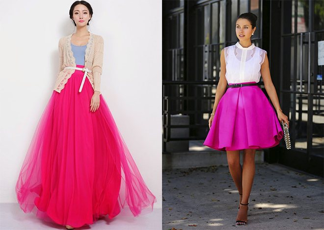 Пышная розовая юбка гармонирует со светлыми тонами. Если ее оттенок светлый, но неяркий, то подойдет нежно-желтый, кремовый и жемчужный цвет. Голубая блузка нежного цвета хорошо дополнит такой наряд. Более насыщенный розовый тон будет сочетаться с вишневыми, темно-красными и бордовыми оттенками. Черные тона будут тоже гармонировать с ярко-розовым низом, а вот от синего, зеленого и коричневого цвета лучше отказаться.