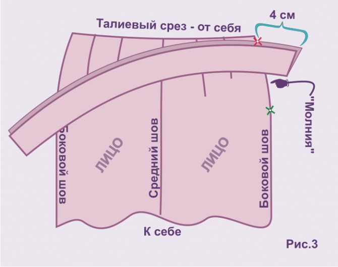 Накладываем центральную частью юбочки на боковую, совместив по линии и приметываем.