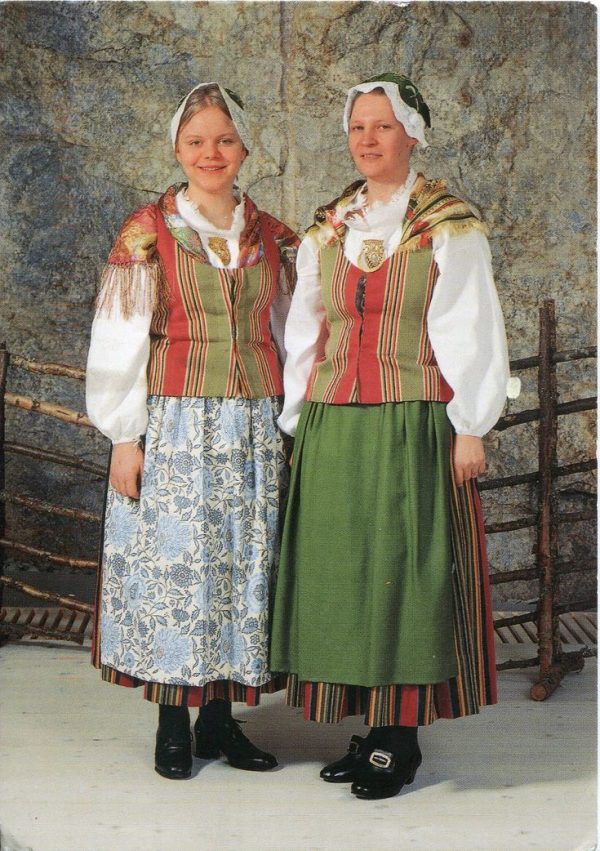 Национальный костюм финнов отличается холодными и строгими цветами с узорами этнического жанра и своей элегантностью. Костюм для финских женщин состоял из длинной юбки, которая украшалась передником, а сверху блузы надевалась безрукавка-лиф, а также жакет в сочетании с обувью с носками. Незамужние девушки могли быть без чепцов, а вот женщины, состоящие в браке, обязательно надевали головной убор.