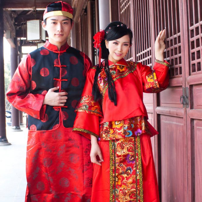 - Китайцы. Мужской гардероб — брюки ку, рубашка. Часто одежды было много, поскольку на Севере климат холодный. Сверху носили куртку на ватной подкладке длиной до середины бедер. Преобладающий цвет мужского костюма — красный. Шили наряды исключительно из натуральных материалов. Для женщин — платье с удлиненными рукавами и накидки. Богатые китаянки носили шубы из натурального меха.