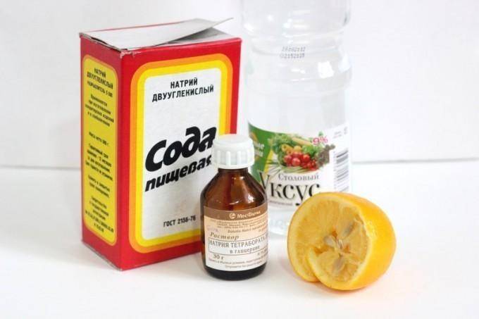 - Раствор соды и столового уксуса, смешанных в равных пропорциях наносится на загрязнённую область на 20-30 минут.