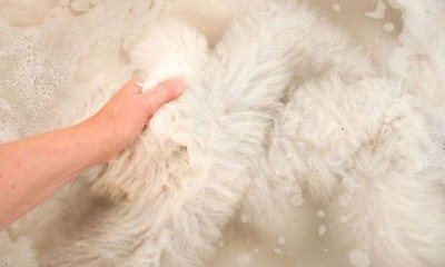 - Если есть желание и свободное время, можно постирать изделие на руках в теплой (не горячей!) воде. Поскольку овчина — это мех животного, вместо мыла или стирального порошка можно взять любой шампунь: взрослый, детский, для кошек, собак или лошадей.