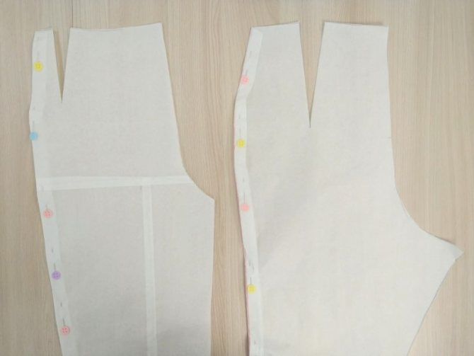 01. Начиная от линии колена заужаю переднюю и заднюю половинку на 2 — 3 см. по линиям бокового и шагового срезов.