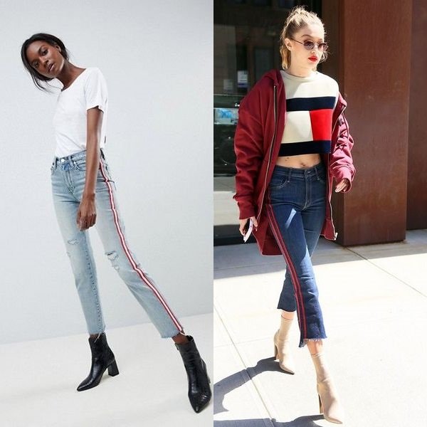 Расцветка джинсов может варьироваться от самых светлых оттенков до черных, но пока самыми популярными остаются темно-синие джинсы с узкими двойными лампасами красного или белого цветов. Такие известные бренды, как Зара, Фаберлик, представили модели с широкими или узкими малиновыми лампасами на джинсах светлых, а также черных оттенков.