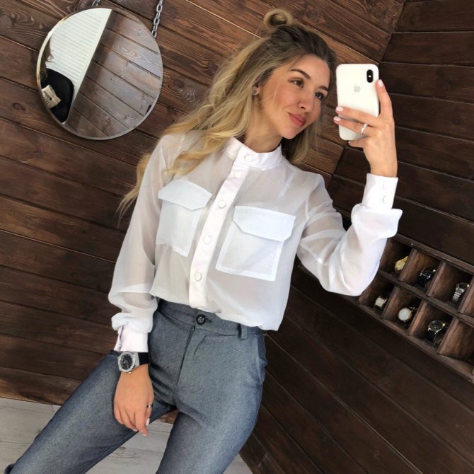 Прекрасным дуэтом станут брючки 7/8 или классической длины со стрелками в сочетании с приталенной рубахой. Для неофициальных обедов и ужинов или офисного лука лучшим выбором станет такой микс, как белая рубашка с брюками, носить которые стоит с обувью на высоком каблуке.