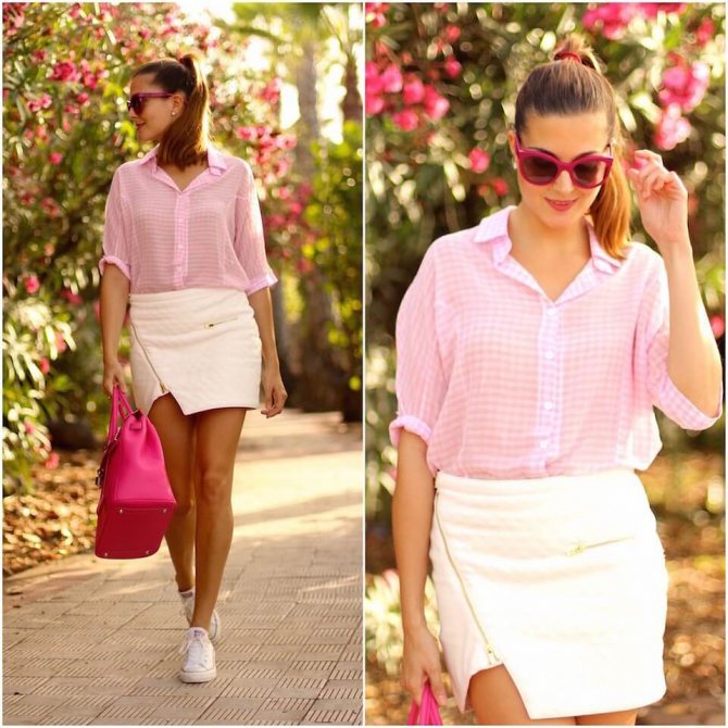 Романтичные и мягкие образы получаются с юбкой-миди. Добавив шляпку и минималистичные босоножки, можно смело отправляться на свидание или дружескую вечеринку. Решая, куда и как носить белую рубашку с юбкой-мини, стоит остановиться на верхе розового цвета, белых кедах и чувствовать себя комфортно на прогулке, в кино или в путешествии.